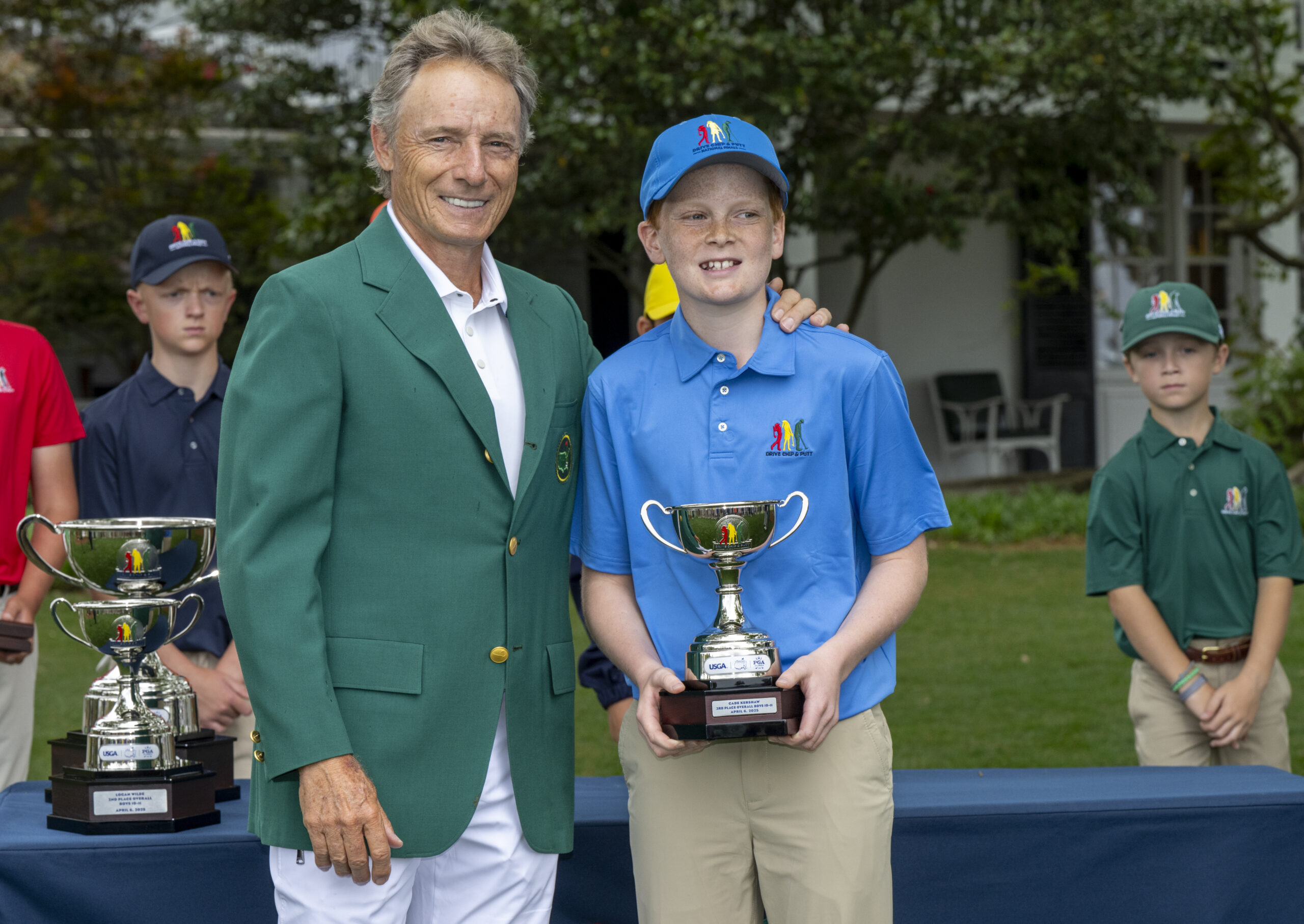 Masters Champion Bernhard Langer presents Cade Kershaw of Boys 10-11 group with his third place overall trophy at the Drive, Chip and Putt National Finals at Augusta National Golf Club, Sunday, April 06, 2025.